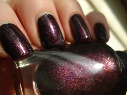 Problem Child is anything but. I am in love love love with it! So much so that I bought two bottles. Call me crazy, I can handle it. Anyway, it is a deep eggplant purple shimmer with firey copper flakies that add depth and show themselves when the light is right.